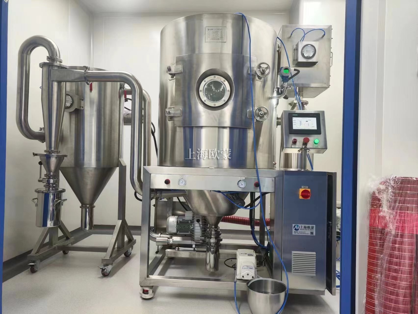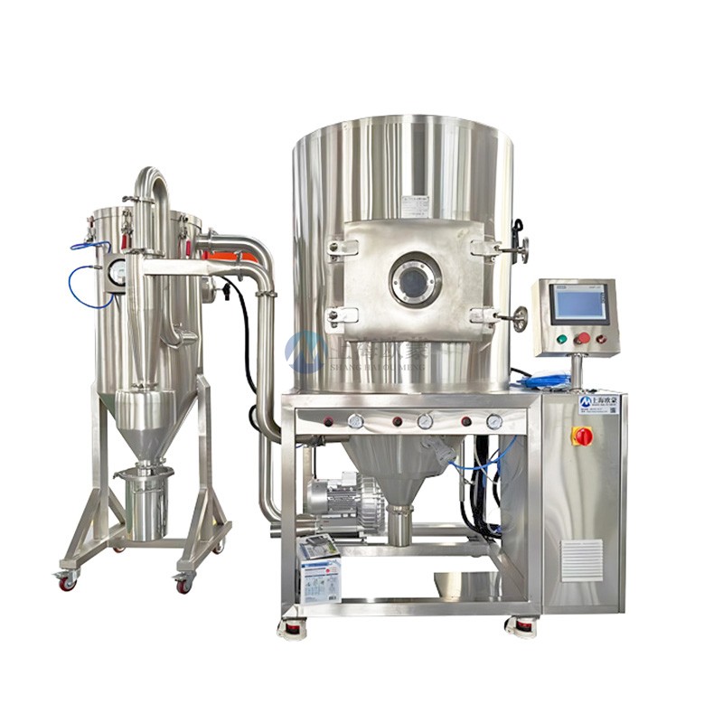 噴霧干燥機(jī)為開式循環(huán),并流式,離心式霧化。干燥介質(zhì)空氣經(jīng)過初、中效空氣過濾器過濾后根據(jù)操作指令由鼓風(fēng)機(jī)吸取再經(jīng)加熱器加熱通過高效過濾器的熱風(fēng)分配器進(jìn)入噴霧干燥主塔。液體物料根據(jù)操作指令經(jīng)過蠕動泵,進(jìn)入高速旋轉(zhuǎn)的離心噴頭,在離心力作用下被分散成小霧滴。在噴霧干燥主塔內(nèi),小霧滴與熱風(fēng)在充分接觸,沿其特定路徑進(jìn)行熱交換后被干燥成為產(chǎn)品,然后通過旋風(fēng)分離器實(shí)現(xiàn)分離,固體物料被收集,氣體介質(zhì)再經(jīng)過過濾后被排出。整套噴霧系統(tǒng)易清潔、無死角,符合GMP要求。