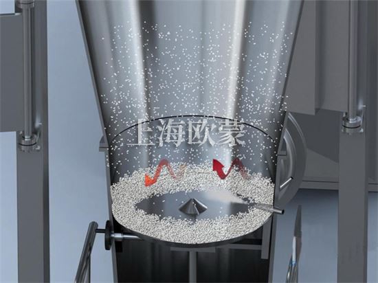 空氣經(jīng)加熱凈化后,由引風機從下部導(dǎo)入,穿過料斗的孔網(wǎng)板。在工作室內(nèi),經(jīng)攪拌和負壓作用形成流態(tài)化,水份快速蒸發(fā)后隨著排氣帶走,物料快速干燥。